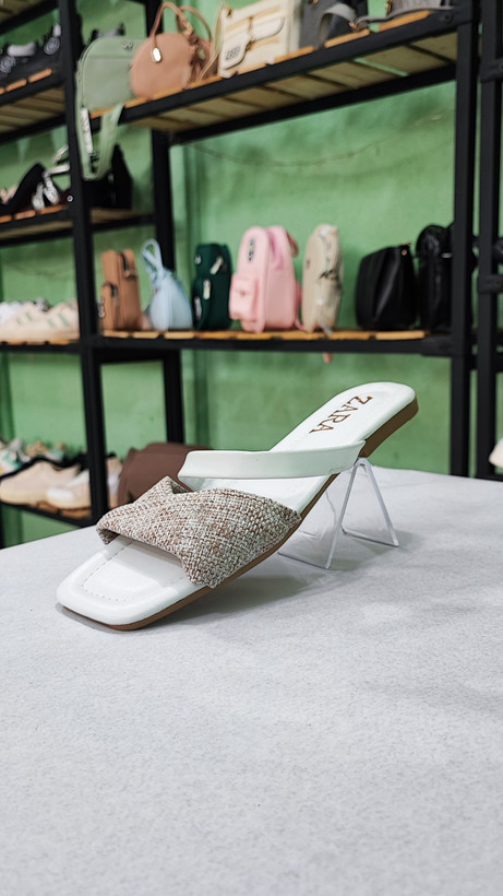 صندل زنانه زارا بدون پاشنه بند کنفی رنگ سفید